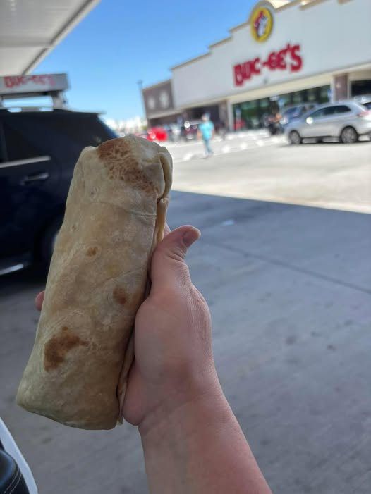 I’m somehow Standing there with a cart full of fudge, a brisket sandwich the size of my face., matching family Buc-ee’s shirts, and a cast iron skillet I absolutely did NOT need